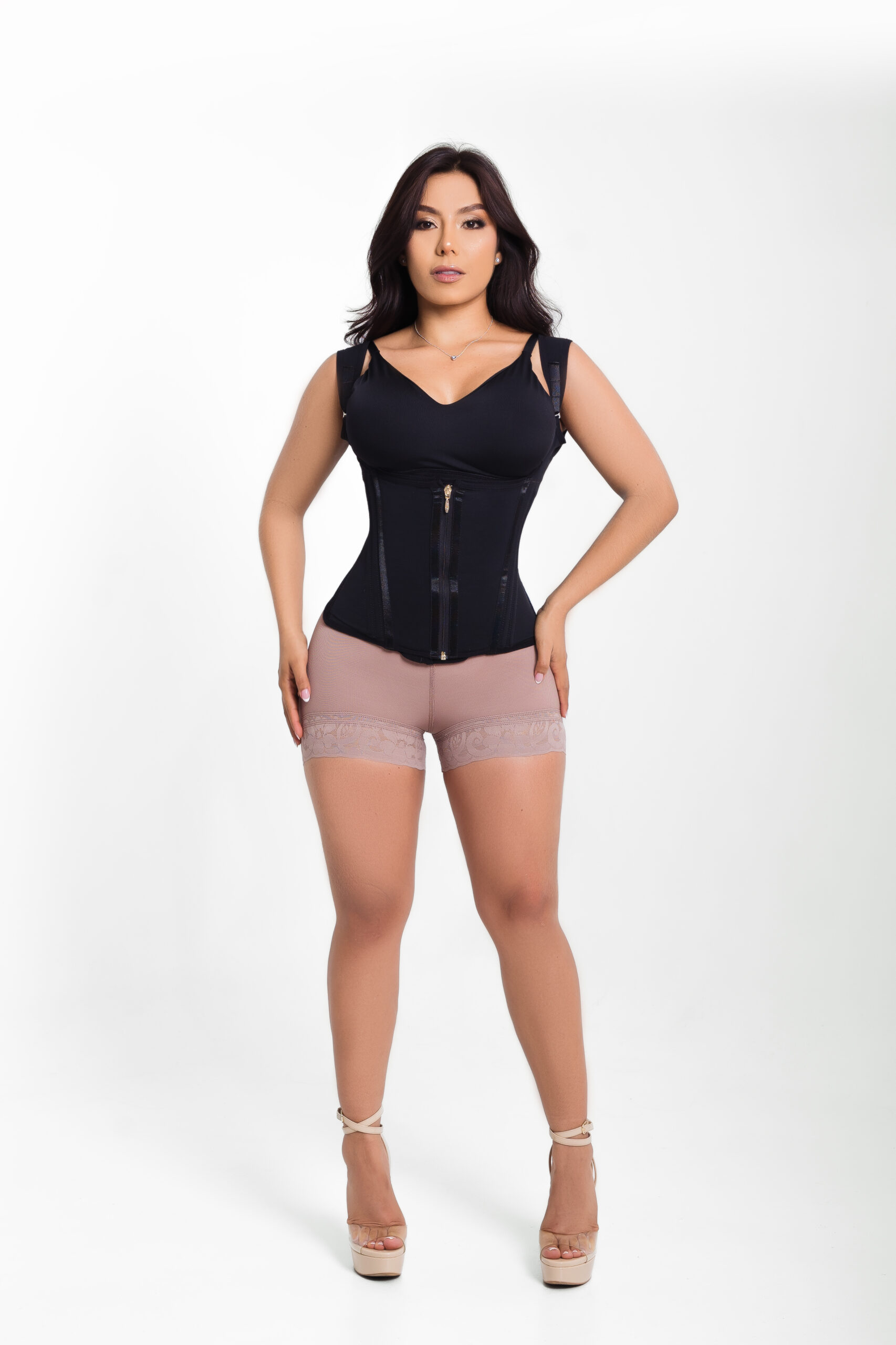 Tiene cremallera frontal en la parte exterior que brinda mayor discreción, y en la parte interior 3 niveles de broches para lograr un ajuste ideal. Cuenta con 13 varillas internas que brindan alto control y moldeo.